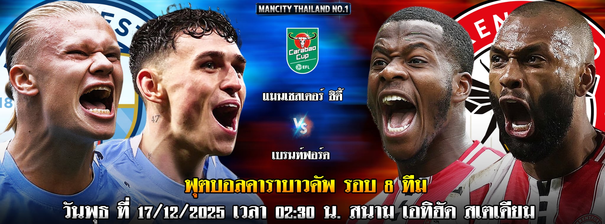 พรีวิว คาราบาวคัพ รอบ 8 ทีม: แมนเชสเตอร์ ซิตี้ พบ เบรนท์ฟอร์ด (17 ธ.ค. 2568)